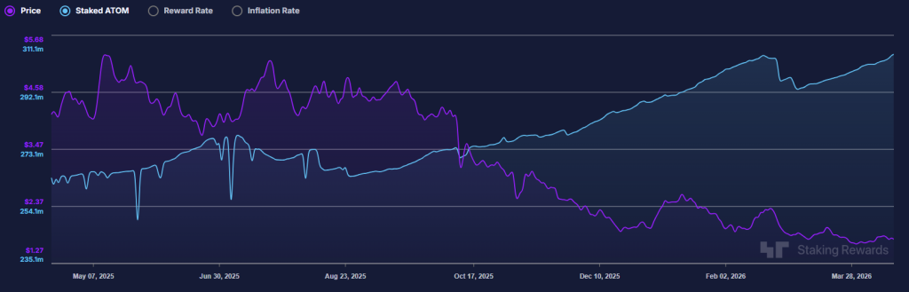 | ATOM w stakingu | ~311M (~62% supply) (StakingRewards) historyczne ATH stakingu, mocno ogranicza płynną podaż na rynku |